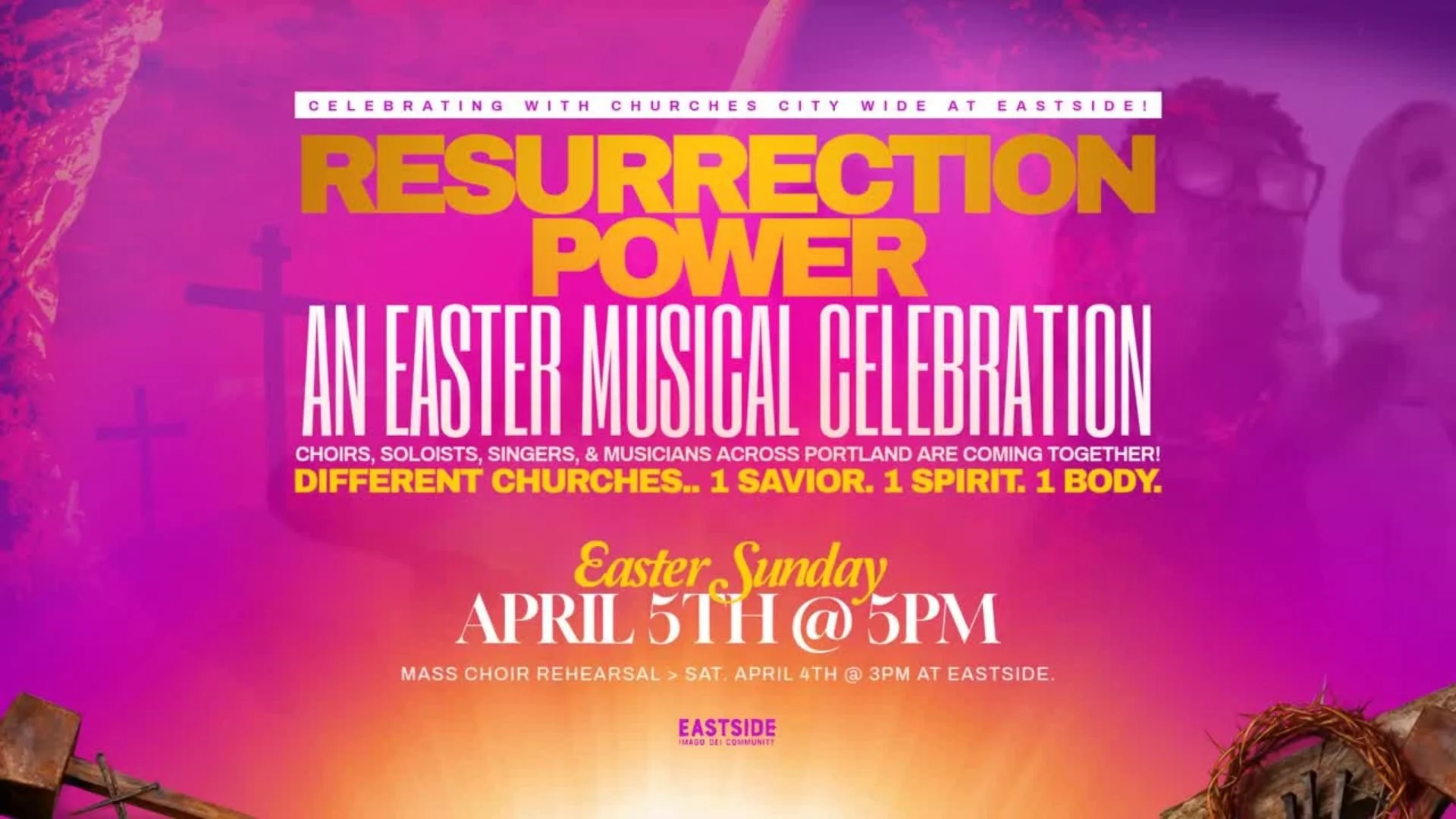 Family, mark your calendars! On Easter Sunday, at 5pm, we’re gathering right here at Eastside to celebrate the resurrection of Jesus Christ with other churches in the city. Choirs, soloists, singers, and musicians from across Portland are coming together — different churches, one Savior. One Spirit. One body. So bring a friend! Bring your praise! And if you know what to do with it, bring the tambourine!.